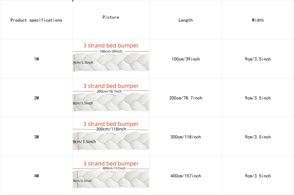 Disponible en différentes longueurs – 2M, 3M et 4M – ce tour de lit tressé s’adapte à tous les lits, berceaux, parcs et bassinettes. Choisissez simplement la longueur nécessaire selon votre installation.